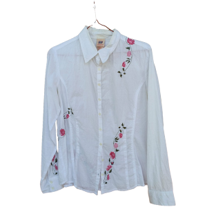 Kemeja Putih Wanita Lengan Panjang dengan Bordir Bunga Mawar Merah Muda